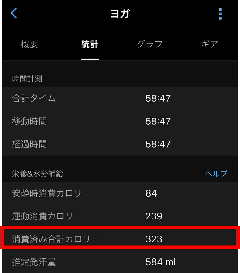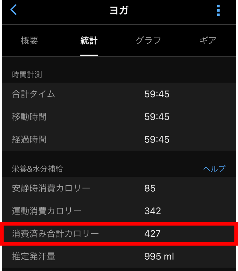 ホットヨガレッスンを受けている時の、消費カロリー、推定発汗量、心拍数などは、スマートウオッチ(GARMIN Forerunner 965 Android/iOS)で測定しました。