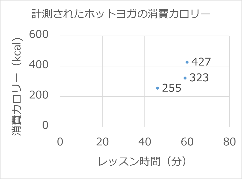 しかし、私(男性)が実際にホットヨガレッスンで消費したカロリーを計測した結果、約1時間のホットヨガで255~427kalでした。