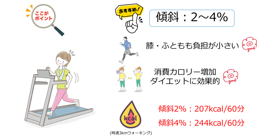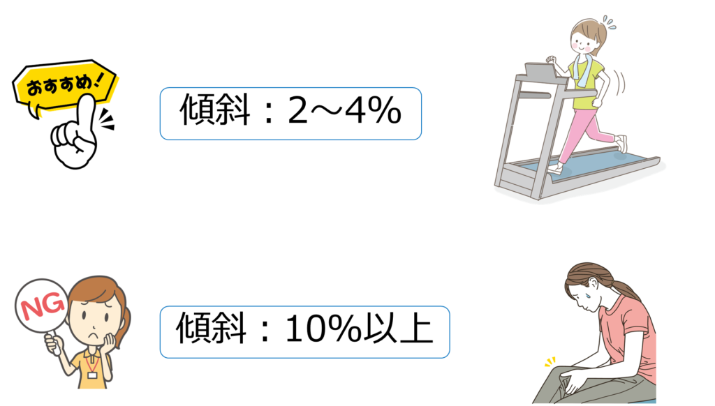 傾斜2~4%くらいに設定すると、ひざの負担も少なくてかつダイエットに効果的です!
