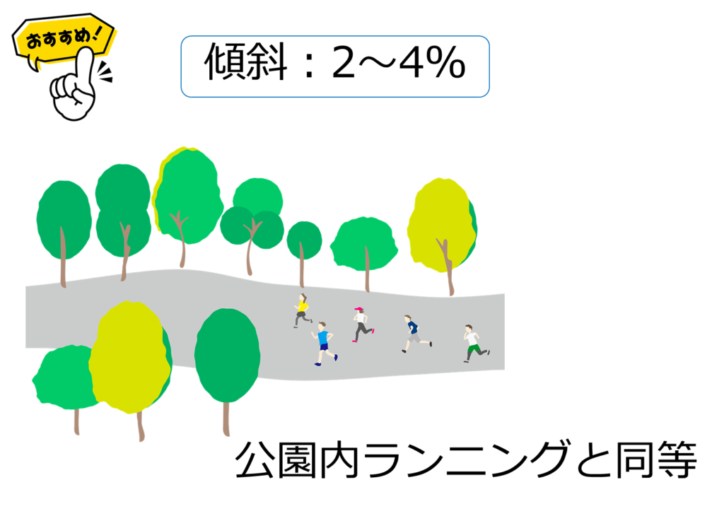 理由1)傾斜2~4%程度にすると、アウトドアでウォーキング・ランニングしたりするのと同じような状態になります。